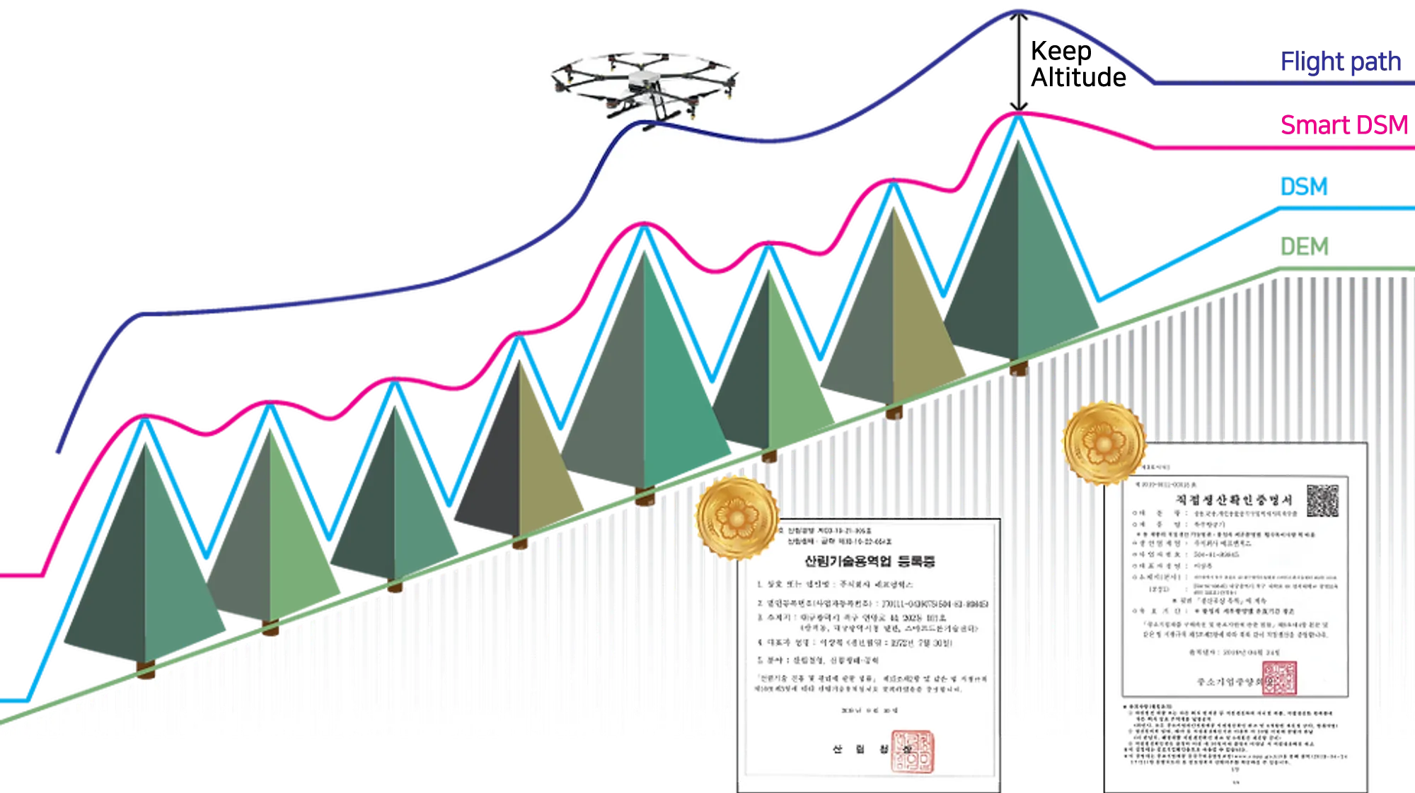 The DSM obtained through forest surveillance is processed into a smart DSM that can support efficient autonomous flight of drones. The smart DSM has a higher relaxation rate than the existing DSM, so the data capacity is lighter and is more precise than the DEM.