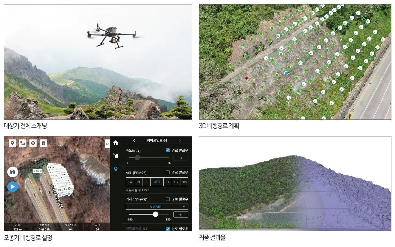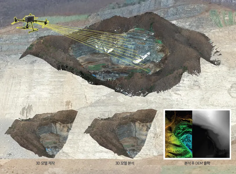 고정밀 고품질 카메라 L1을 사용하여 촬영하며, 촬영 실시간 미리보기를 할 수 있어 초기 에러 발견에 유리합니다. 드론(LiDAR)로 측량한 데이터는 3D 모델링, 정사영상, DEM 등으로 도면화 가능하며, 3D 모델을 활용하여 앞으로 진행이 예상되는 채굴을 파악하여 미래의 채굴량을 예측할 수 있습니다.