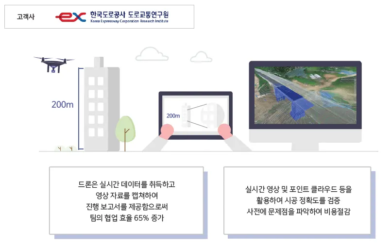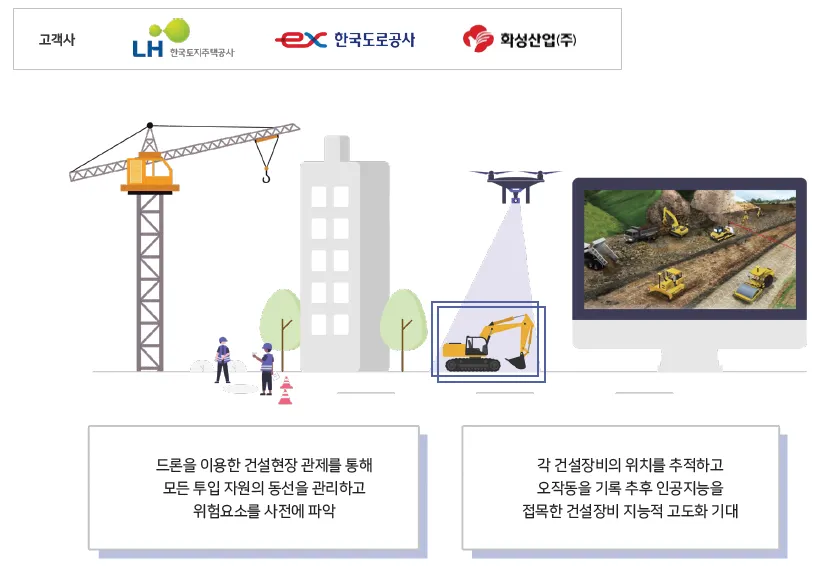 드론을 활용하여 관리자가 실내에서 건설 장비가 제 위치에 있는지 확인하여 우발적인 상황에 대처하고 장비를 효율적으로 운용할 수 있습니다.