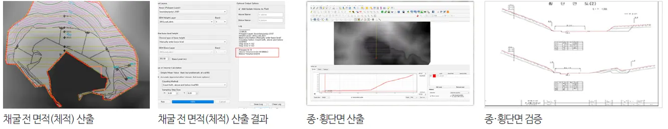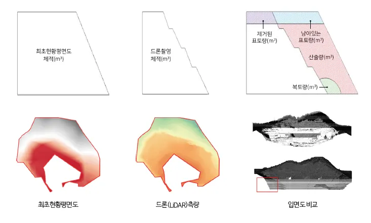 최초(인허가 당시)의 기존 데이터와 드론(LiDAR) 데이터를 각각 DEM으로 변환합니다. GIS 및 토목 전문 프로그램을 활용하여 수평투영면적으로 면적 및 체적량을 산출하고, 표토량, 복토량 등을 연산하여 산출량을 계산합니다. 또한, 평면도, 입면도 등의 도면을 작성하여 기존 데이터와 비교 분석이 가능합니다. 최종 분석결과 데이터를 다년간 보관함으로써 지속적인 유지관리에도 유리합니다.