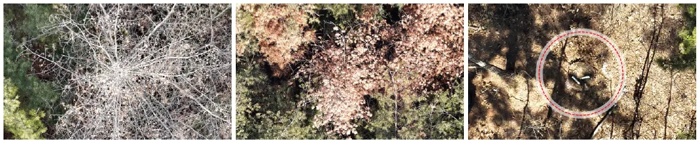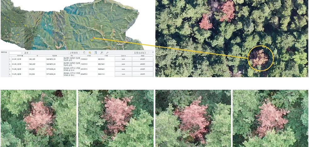 드론을 활용하여 1m이내 정확한 고사목의 위치좌표를 취득할 수 있습니다. 영상분석 결과는 정사영상 관리시스템을 통해 각 지자체 및 유관기관에서 활용할 수 있습니다. 에프엠웍스는 2019년 소나무재선충병 예찰사업에서 산림 POI 촬영을 통해 고사목 현장조사의 수고를 줄이고 영상분석 결과의 신뢰도를 검증하였으며 QGIS 기반의 고사목 영상관리 플러그인을 개발 및 보급함으로써 활용성 높은 사업성과를 제시하였습니다.
