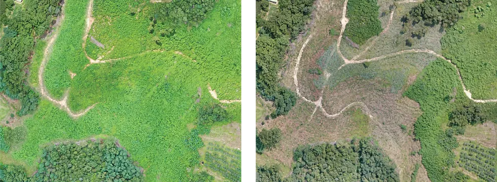 풀베기 사업 전후비교 및 사업관리 전반에 드론을 활용함으로써 광범위한 사업대상지 전체를 한눈에 직관적으로 통제/관리할 수 있습니다. 또한 드론영상을 분석하여 사업 전후의 작업유무를 정밀하게 비교할 수 있습니다.