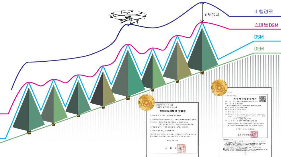 드론을 직접 조종하여 원시영상을 취득하는 수동비행은 자동경로비행에 비해 더 긴 작업시간과 더 많은 배터리 구입, 더 많은 위험비용의 부담, 더 좁은 작업영역으로 비효율적인 방법입니다. 또한 정사영상은 FGMS, FGIS 등 산림 GIS 프로그램과 연동하여 산림병해충의 예찰, 숲 가꾸기 사업의 검수, 산사태·산불 등의 산림재해 면적계산 등 많은 분야에서 활용이 가능합니다.