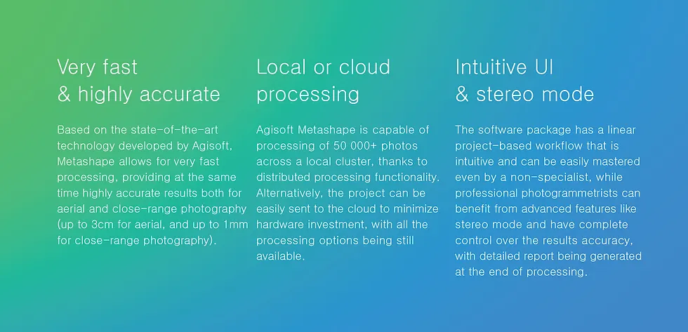 Metashape는 항공사진을 위한 완벽한 툴입니다. 급성장하고 있는 UAV산업에 필요한 기능이 지속적으로 개발/ 지원되고 있습니다.거대 스케일 피사체의 정밀 폴리곤 모델 구축은 물론, 더욱 상세한 DSM/ DTM과 고해상도의 정사영상제작을 위한 Dense Point Cloud를 사전 작업할 수 있는 전문가 수준의 후처리 도구임이 입증되었습니다.